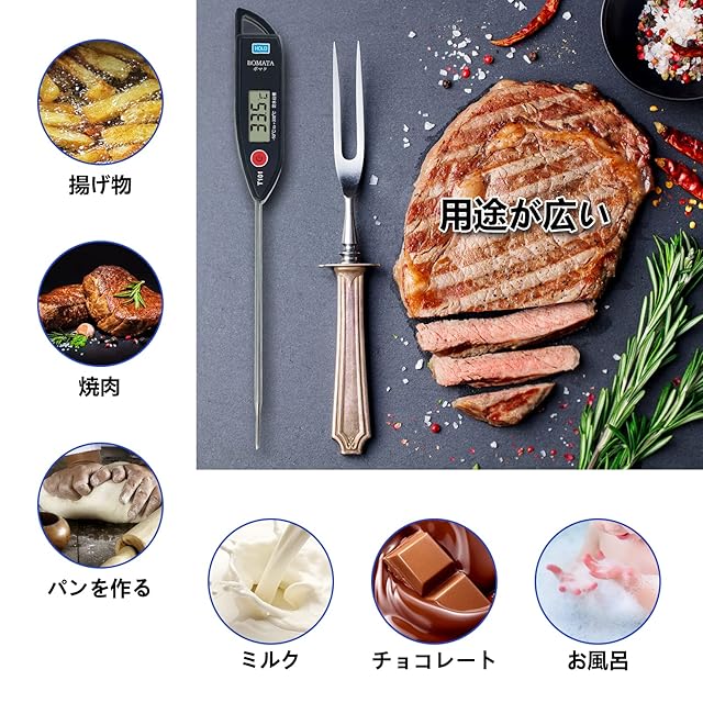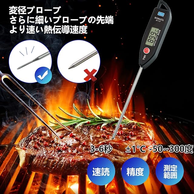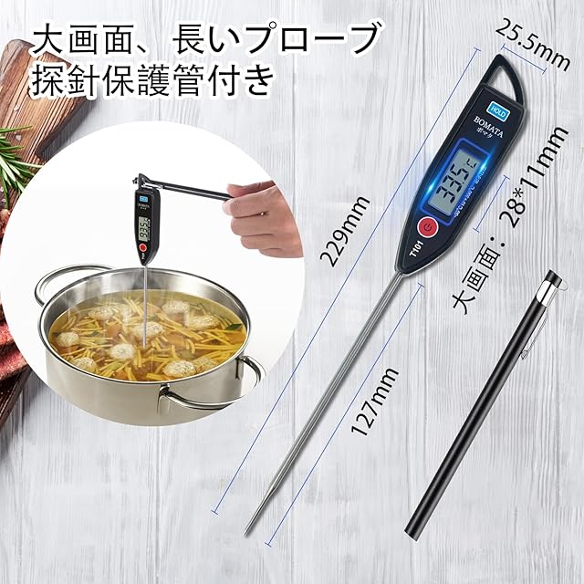 商品名:BOMATA 温度計 料理 防水 丸洗い 速読3~6秒 -50~300℃ 水温計 キッチン 12.7cmのプローブ ホールド機能付き LCD大画面 304ステンレス 壁掛け穴 揚げ物 油温 てんぷら お肉 お風呂 牛乳などの温度測量用 調理用 T101A黒い