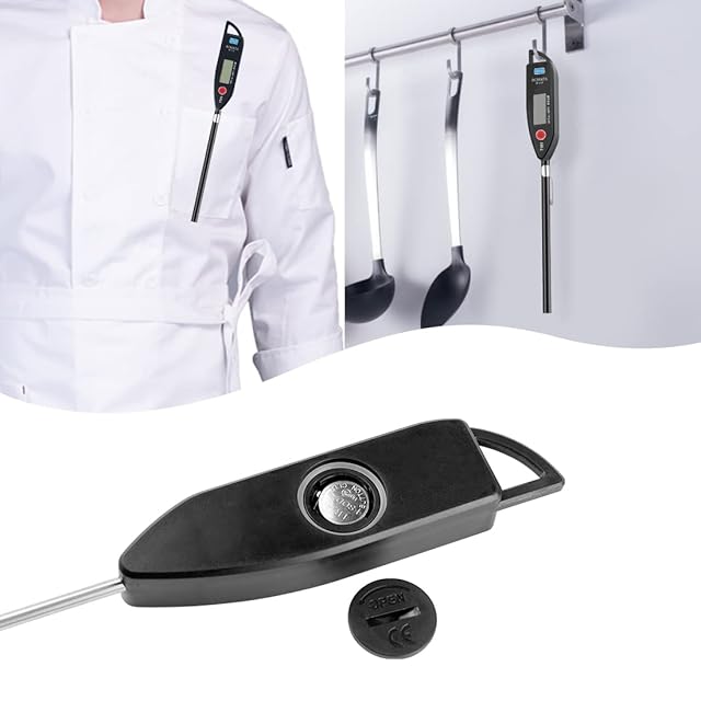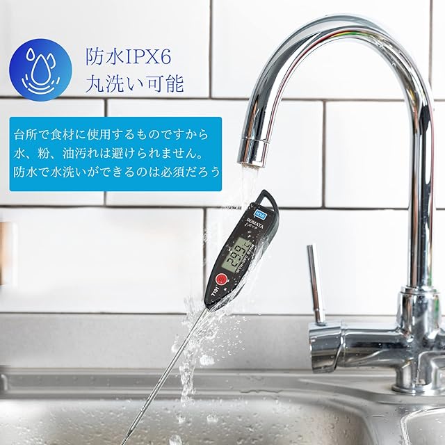 【防水IPX6、丸洗い】台所で食材に使用するものですから水、粉、油汚れは避けられません。防水で全体洗えるのは商品の優れたところの一つです。汚れた場合、検温部分も液晶部分も含めて全体的に水で洗えます。お手入れ簡単でいつでも清潔、とても便利な温度計です。
