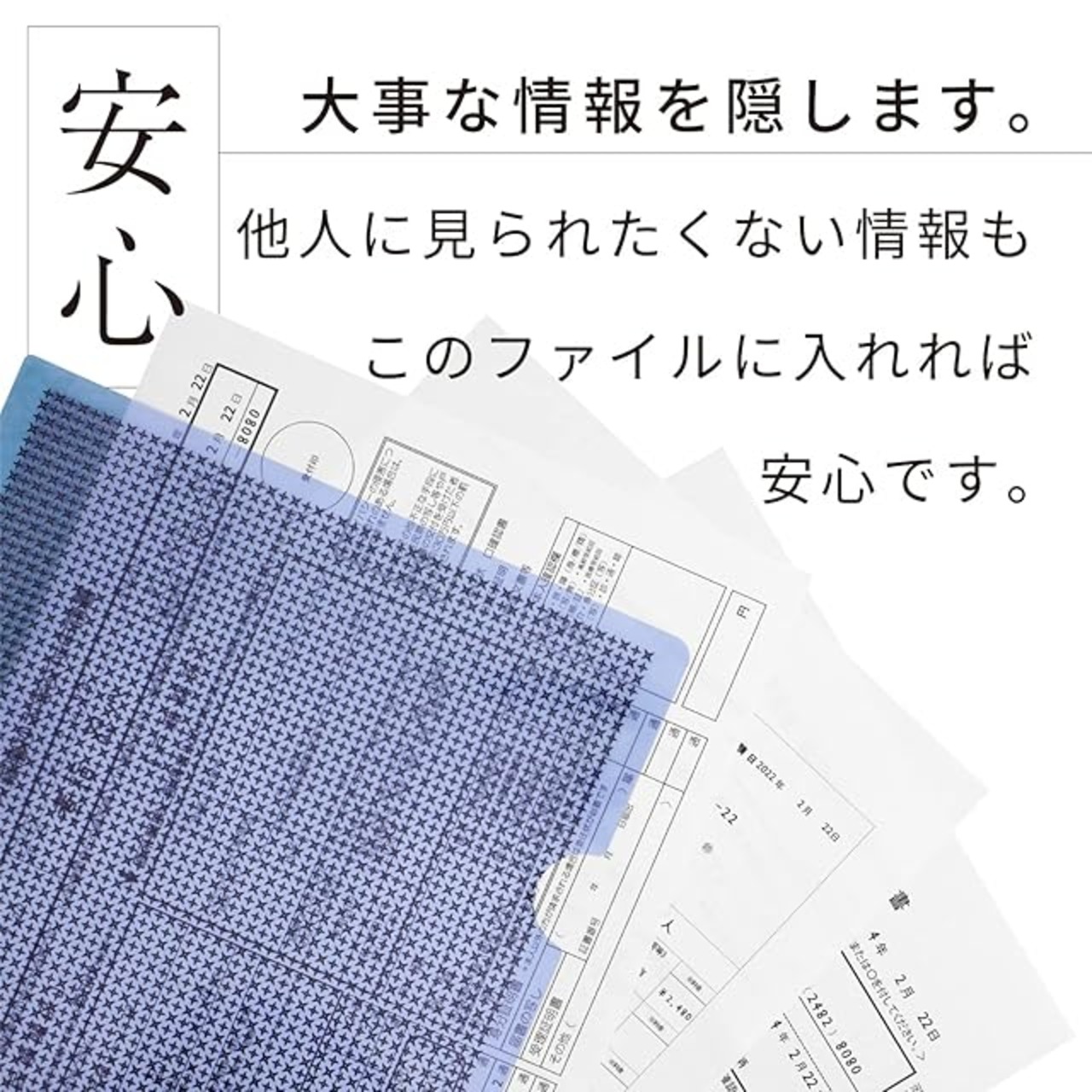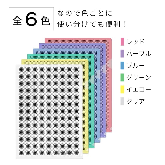 【商品仕様】①手裏剣パターンにより、机の上に放置しがちな大切な資料の情報もしっかりと守れます。大きい文字はぼんやり見えるので、ホルダーに入っている書類が何なのかは識別可能で都度中身を確認しなくても大丈夫。②クリアファイルの4つ角を全て丸く加工しているので、けがの恐れもなく安全にご使用頂けます。③国内ファイルメーカーで生産しているので、安心のクオリティです。(厚みは一般的なクリアファイルと同等(0.2mm厚)です) ④全6色(透明 / 黄色 / 青 / 赤 / 紫 / 緑)展開なので、書類の種類によって使い分ける事が可能です。 【使用例】オフィスでの使用はもちろん、銀行や病院へ行く際に書類を持ち運ばなければいけない時にも、バッグまで用意しなくても大丈夫。書類を汚さず、折らず人に見られずに書類を持ち運びする事が可能です。