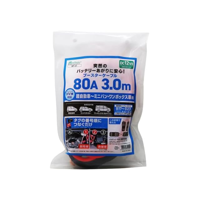 商品名:メルテック(meltec) ブースターケーブル HV車対応~普通自動車用 DC12V・80A 3m BT-21