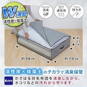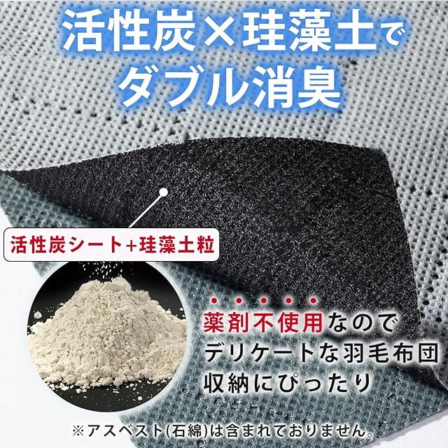 【活性炭&珪藻土の力で消臭】:活性炭と珪藻土のダブルの力で消臭保管。来客用などの敷布団をにおいやホコリなどの汚れからしっかり守る。