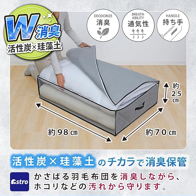 アストロ 消臭 敷布団収納ケース 活性炭と珪藻土のWパワー 消臭保管 通気性の良い不織布がホコリなどの汚れをガード 出し入れや持ち運びがしやすい持ち手付き 3層構造の厚手でしっかりとした生地 透明窓付き 布団収納 布団袋 収納ケース 引っ越し グレー 615-26
