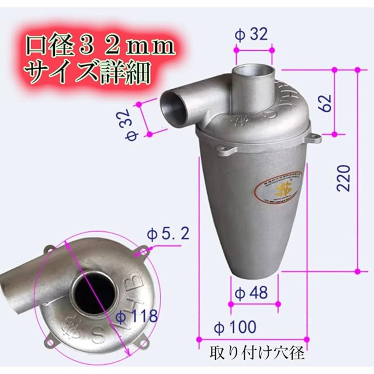 【仕様】 口径25mmと32mmの2種類のサイズがあります。 アルミ合金製(アルミ鋳物)外形寸法 25mm:100*105*185mm 32mm:135*105*200 重量 口径25mm:280g 32mm::450g 風量 25mm::20m3/h 32mm: 32m3/h 静圧 25mm::2kpa 32mm:2kpa 市販の掃除機や集塵機に取り付けてペール缶や一斗缶 ドラム缶 などの容器に吸い込んだ物を集めるようにできます。容器の中にゴミ袋を入れておけばそのまま袋ごと捨てる事ができて面倒が無く便利に使用できます。色々なものを吸い込んで収集することができます。木くず おがくず 野菜くず 砂 落ち葉 芝生 ほこり 石 砂利 鉄くず 切削くず セメント コンクリート モルタル など吸い込んで掃除できます。 アルミ合金製なので樹脂製のものと比べて静電気も起きにくく静電気でほこりがついて面倒ということもありません。耐熱性もあるので切削したばかりの切削くずなどを吸い込んでも溶けたりする心配がありません。 農業や自家菜園などに携わる方のにも 細かい野菜くずなどを集めるのにも役に立ちます 細かい野菜くずなどを集めるのにも役に立ちます マイホームの敷地内に飛んできたゴミや落ち葉なども吸い取ることができます。芝生があるご家庭は芝刈りの後の芝を吸い込んで掃除できますので非常に効率的です。
