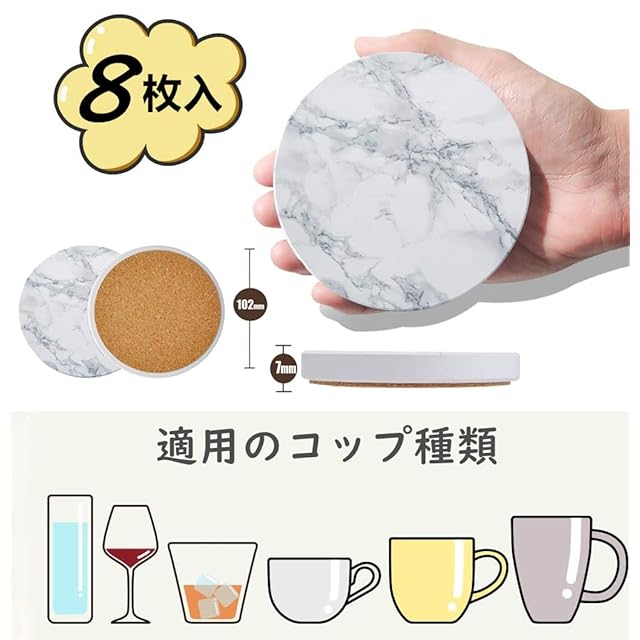 ✅【上質セラミック】コースターは上質なセラミックを採用しました。「断熱性」に優れ、熱いカップを乗ったら、テーブルやデスクを高熱から保護できます。吸水性がよい、冷たい飲み物が溶けた時の結露や残された汚れを素早く吸収し、机の乾燥や清潔を保ち、湿気を防ぎ、細菌を抑えます。