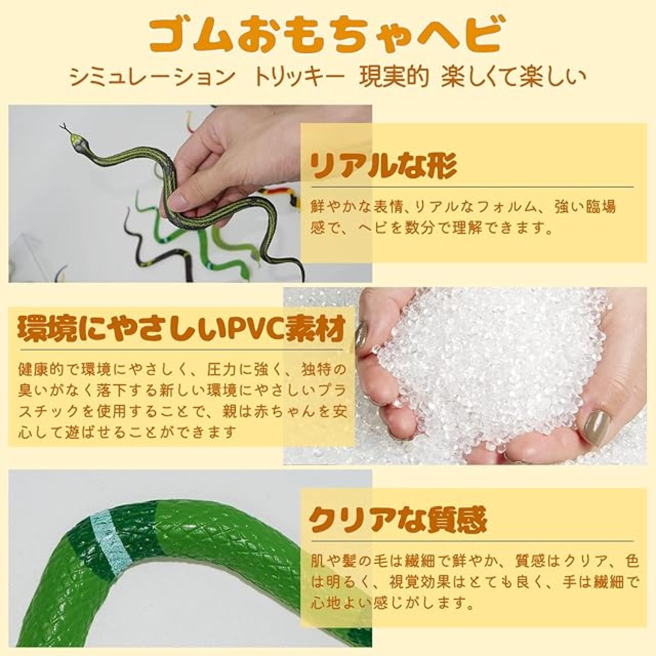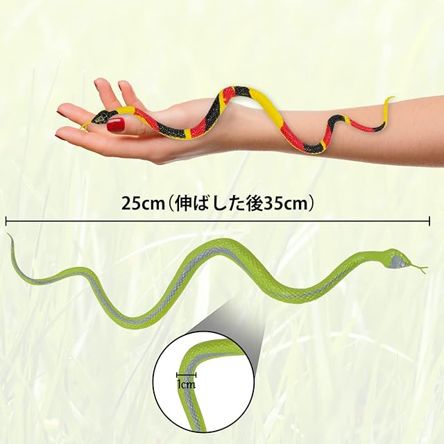 <br>製品仕様 <br>梱包内容:ヘビ×12本 <br>サイズ:35×1㎝ <br>重量:12g(1匹) <br>素材:PVC <br>カラー:マルチカラー