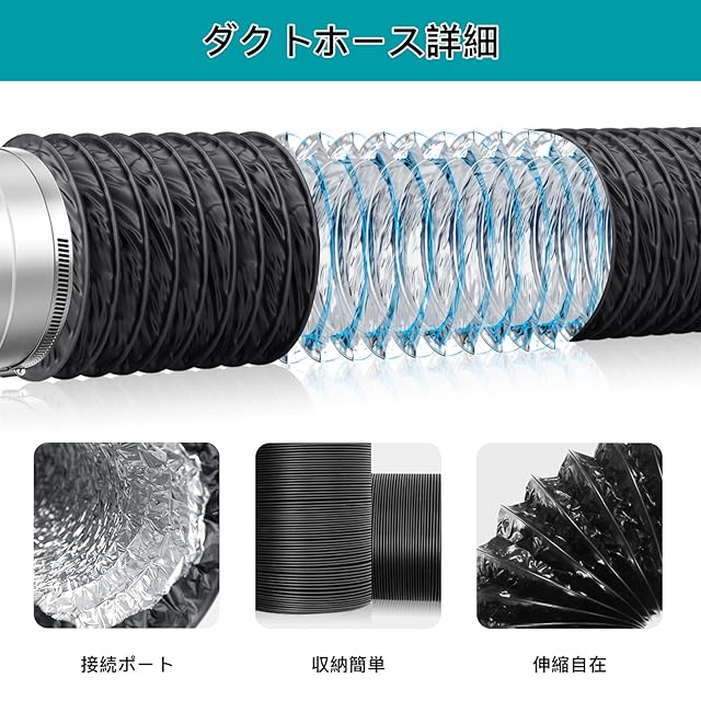 【気密性&難燃性】安心特殊三層構造+高強度鋼線を採用され、気密性と難燃性があり、丈夫で復元力がいい。普通のアルミホースと比べて、PVCダクトホースはUV耐性があり、耐久性がもっと優れます。伸縮や屈曲ができ、折り曲げてもつぶれたり、変形しにくい。