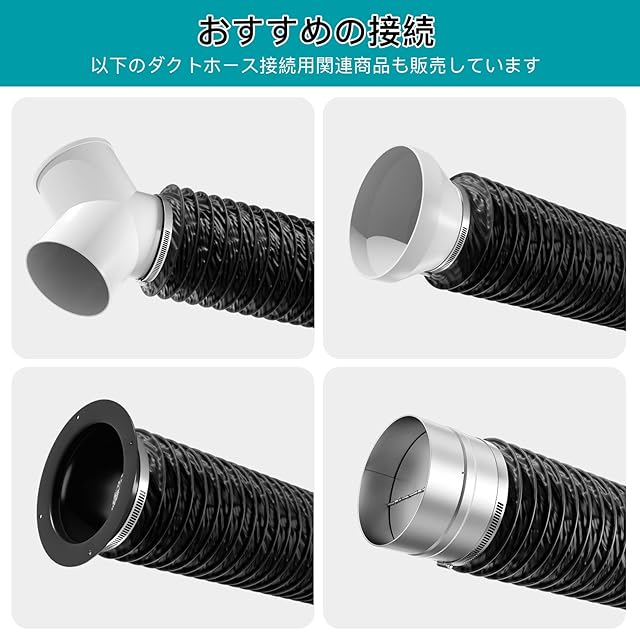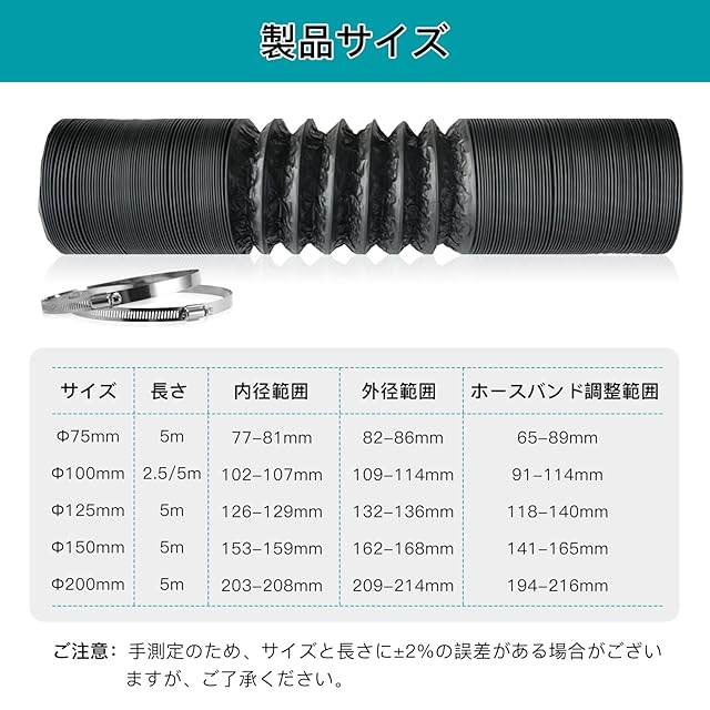 【ダクトホース セット】製品内容:ダクトホース+固定用ホースバンド(贈り物)、適用ダクトファンや換気部品直径:Φ100mm、ダクトホース本体内径:102-107mm左右、ダクトホース本体外径:109-114mm左右。材質: PVC+PET+アルミ箔+鋼線、長さ:最長2.5m、使用温度範囲:-30℃-150℃、おすすめ長期使用温度範囲:-10℃-100℃。ダクトファンの騒音低減に役に立つ、ノイズを最大 50% 低減可能です。