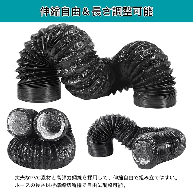 【伸縮自由&長さ調整可能】折り曲げでも漬れにくい設計になっているので通気性もしっかり確保。丈夫なPVC素材を採用され、伸縮自由で破れにくい。このフレキシブルダクトは金属切断用はさみ或いは標準線切断機で切断しやすい、配管工事も簡単に行えます。ご要望に応じて自由に調整できます。