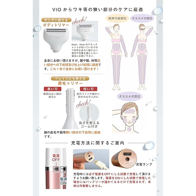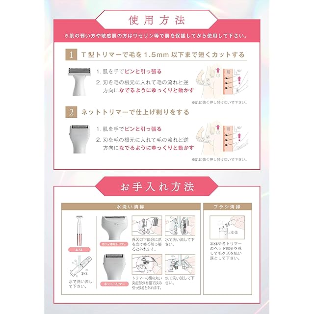 こんな悩みはありませんか?「デリケートゾーンをキレイに処理したい」「脱毛サロン前にVIO処理したい」「カミソリは乾燥や肌荒れする」「除毛クリームはアレルギーやにおいが気になる」「ムダ毛ケアしたいけど、自分にあった方法が見つからない!」そんな女性のためにお客様の声&専門家のアドバイスをベースに開発しました!デリケートなVIOゾーンもしっかりケア!敏感肌でも使えるように肌に優しい設計!どこでも使えコンパクト設計!お手入れは簡単2STEP!①T型トリマーでデリケートゾーン特有の長い毛、太い毛をしっかりカット②ネットトリマーで剃り残しなくつるつるキレイに処理。T型トリマーに付属のアタッチメントを取付すれば、毛量調整や長さを整える事も簡単に!電気シェーバーでよくあるお悩み「肌を傷つけて出血してしまった・・・」「つるつるにならない・・・」当店のレディースシェーバーは風船に押し付けても割れないステンレス素材を使用したプロテクトブレードタイプ。カミソリ負けしやすい肌質の方や金属アレルギーの方にも好評です!デリケートゾーンは全身の中でもケアしにくい部分です。人間工学に基づいた握りやすい持ち手とコンパクトなヘッドでどんな隙間にも入り込んでガンコなムダ毛や細いうぶ毛もしっかりカット!「娘に使わせたいけど安全に使えるか不安・・・」→中高生でも安全にお使い頂けるよう、イラスト58枚に解説が入った取り扱い説明書付きなので安心してご購入下さい。