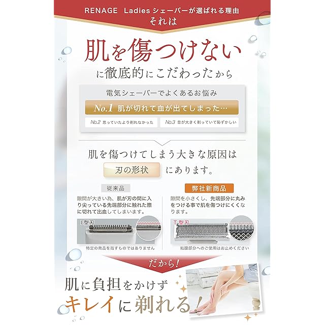 【もう、お肌を傷つけない】電気シェーバーでのお悩み第一位は「肌を傷つけてしまった・・・。」です。私共は肌を傷つけてしまう原因を考え、一つの答えにたどり着きました。それは、「刃の形状」と「剃り方式」 の違いです。刃が直接肌に触れる事でお肌を傷をつけてしまう原因となります。その為、刃が直接肌に当たらないよう「刃の隙間」と「刃の形状」、「剃り方式」を見直し、工場と何度も改良を重ね、安全にケア出来る商品として販売する事が可能となりました。