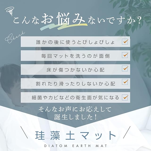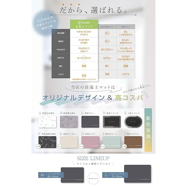 快適なバスタイムをお約束、珪藻土バスマットです。お風呂上がりの足元を一瞬で快適に保つ驚異の吸水力! 高い吸水力:珪藻土が持つ独特の細かな孔構造により、水分を素早く吸収し、足元をすぐに乾燥させます。 優れた通気性:湿気を速やかに放出し、カビや雑菌の繁殖を抑えることができます。 エコフレンドリー:天然素材である珪藻土は環境にやさしく、リサイクルも可能です。 肌触りの良さ:滑らかな表面で足裏に心地良い触感を提供します。 デザイン性:シンプルでナチュラルなデザインが、お風呂場に心地よい雰囲気を演出します。 安全性:滑りにくく、お子様や高齢者にも安心してお使いいただけます。 モニターの発色によって実際の物と色が異なる場合があります。 撮影写真はイメージのため実際の色味や質感・柄の出方が異なる場合がございます。 イメージの違い/モニターとの色味違いでのご返品は「お客様都合での返品」としてお受けしておりますので、予めご了承くださいませ。