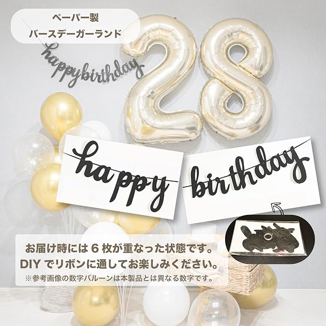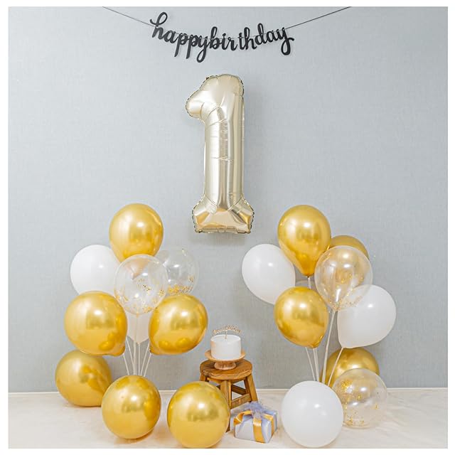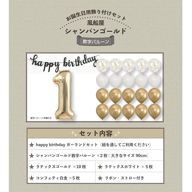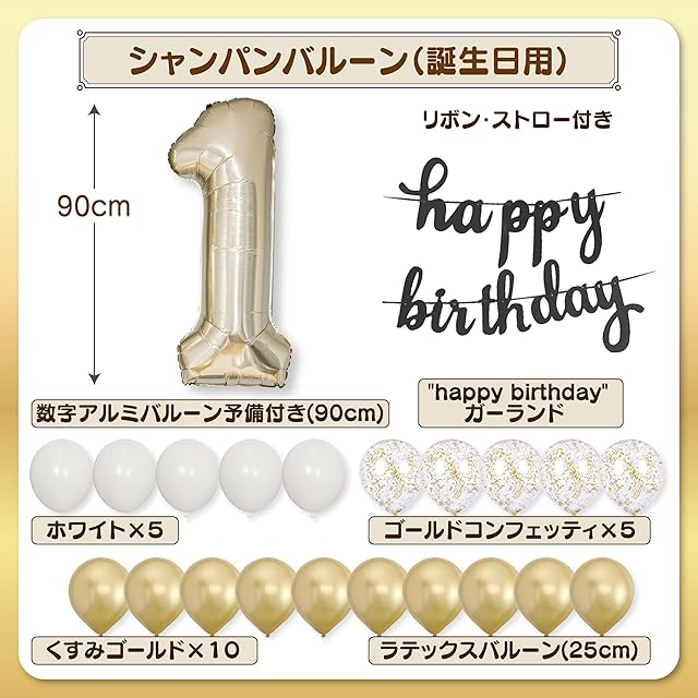 【内容】数字アルミバルーン1歳用 (90cm)、"happy birthday"ガーランド 、ホワイト5枚・シャンパンゴールド5枚・ゴールドコンフェッティラテックスバルーン10枚 合計20枚、ストロー・リボン付き ※スタンド、ケーキ等の小物はセットに含まれておりません。