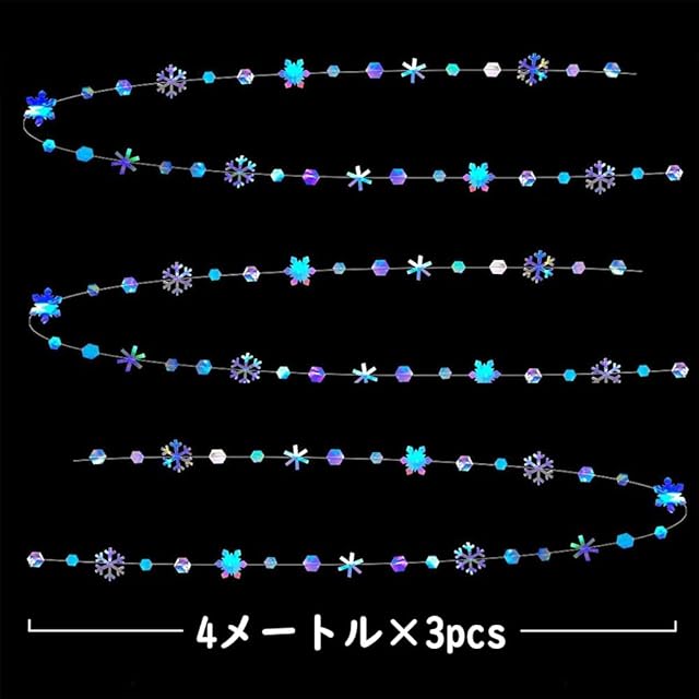 【商品情報】3本雪の結晶ガーランド。長さ:4メートル/本、セット:3本セット、合計12メートル、素材:ペーパー