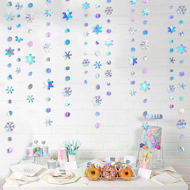 【素材について】この虹色のスノーフレークガーランドは、高品質な両面ホログラフィック紙で作られており、手作りで丁寧に機械縫いされています。丈夫で再利用可能です。
