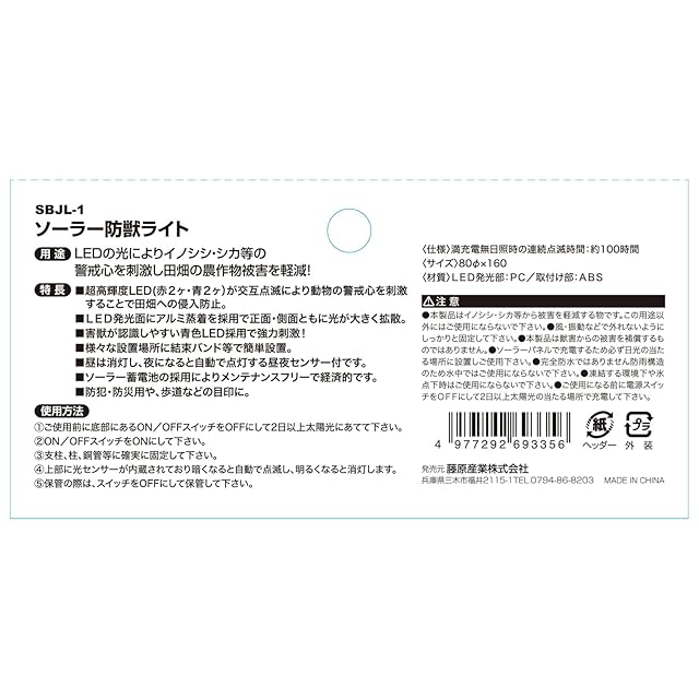 商品名:セフティー3 ソーラーLED防獣ライト 赤/青交互点滅 2LED×2 SBJL-1 5個セット