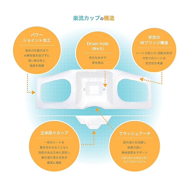 商品名:楽流 カップ 検便 採便 用 シート 【立体形状によりトイレ水に浮べず中空で採取 トイレ流せるタイプ】 (50)