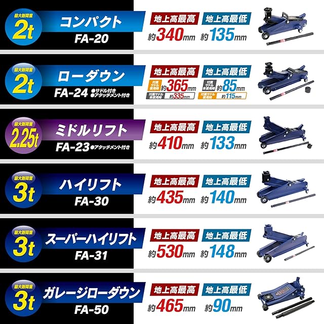 最大耐荷重:2t(最大揚程質量:19.6KN)●最低/最高地上高:約135㎜/340㎜●ストローク:約205㎜●本体サイズ:約450(W)×140(H)×205(D)㎜●重さ:約8.8kg