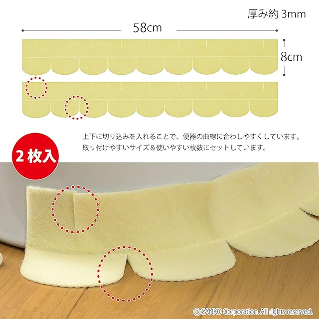 商品名:サンコー トイレ 便器すきまテープ ずれない 貼るだけ 汚れ防止 【日本製 消臭 洗える】 おくだけ吸着 イエロー 2枚 8×長さ58cm OK-95