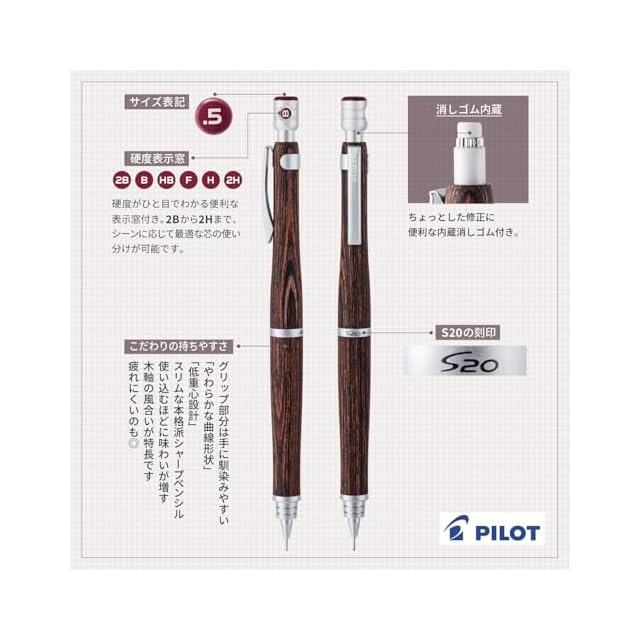 商品名:Pilot シャープペンシル S20 0.5mm マホガニー(HPS-2SK-MA5) 本体サイズ:146x10.6mm/18g
