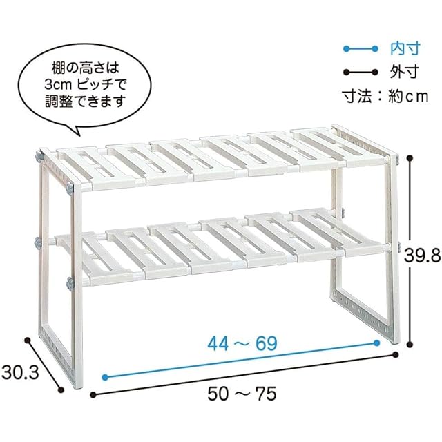 シンク下のサイズに合わせて幅50~75cmの間で伸縮することができ、棚の高さも3cm間隔でスペースに合わせて調節できます。