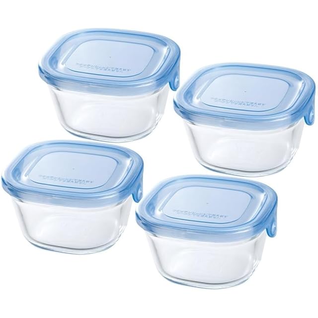 iwaki(イワキ) 耐熱ガラス 保存容器 アクアブルー 角型 SS 200ml ×4個セット パック&レンジ KBC3200BLN