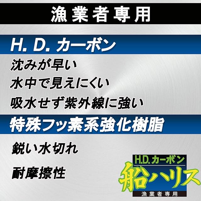 デュエル「H.D.カーボン船ハリス」は、沈みが早い・水中で見えにくい・吸水せず紫外線に強い、といったフロロカーボン独自の特性はそのままに、特殊フッ素系強化樹脂加工による鋭い水切れと耐摩擦性を加え、基本性能を飛躍的に向上しました。