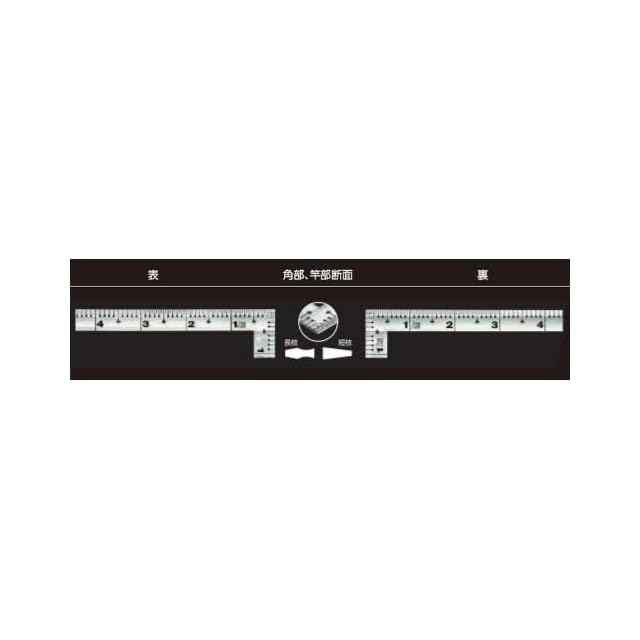 精度●直角度:100mmにつき、0.1mm以下●長さの許容差:±0.2mm以下 表目盛●長枝:外目盛1尺●短枝:外目盛5寸 裏目盛●長枝:外目盛1尺●短枝:外目盛5寸 表示●赤数字入 形状:同厚