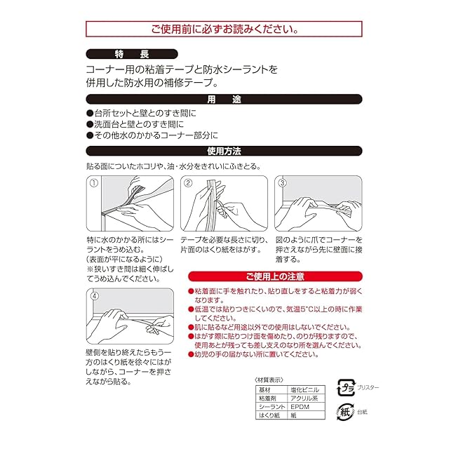 【サイズ】防水コーナーテープ :幅30mm×長さ2m/防水シーラント:幅10mm×長さ1m【セット内容】防水コーナーテープ×2個、防水シーラント×2個【材質】基材:塩化ビニル成型品粘着剤:アクリル系粘着剤はくり紙:紙【生産国】日本