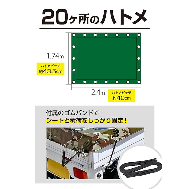 軽トラックの積み荷の保護に! ハトメ(バンド取付穴)が20ヶ所あるので、しっかり留めれる! 本体サイズ:約1.74x2.4m 固定用ゴムバンド付き 約80cmx10本 重さ:約2.2kg