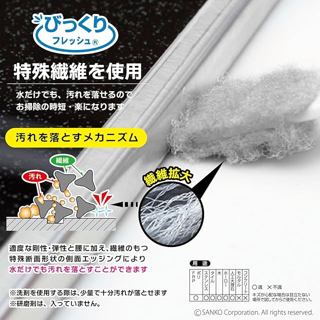 【びっくりフレッシュ(R)】水だけでも汚れが落ちる環境にやさしい商品です。洗剤を使用する場合でもごく少量で汚れが落とせます。