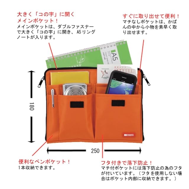 【ポケット内容】メインポケット×1(ダブルファスナー仕様)、マチなしポケット×2、マチ付きポケット×2、ペンポケット×1