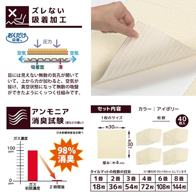 商品名:サンコー おくだけ吸着 獣医師推奨 ペット用撥水タイルマット 30cm×30cm 40枚入 アイボリー 犬 猫 サンコー カーペット 【日本製 撥水 消臭 洗える ハサミでカット可】 KP-57