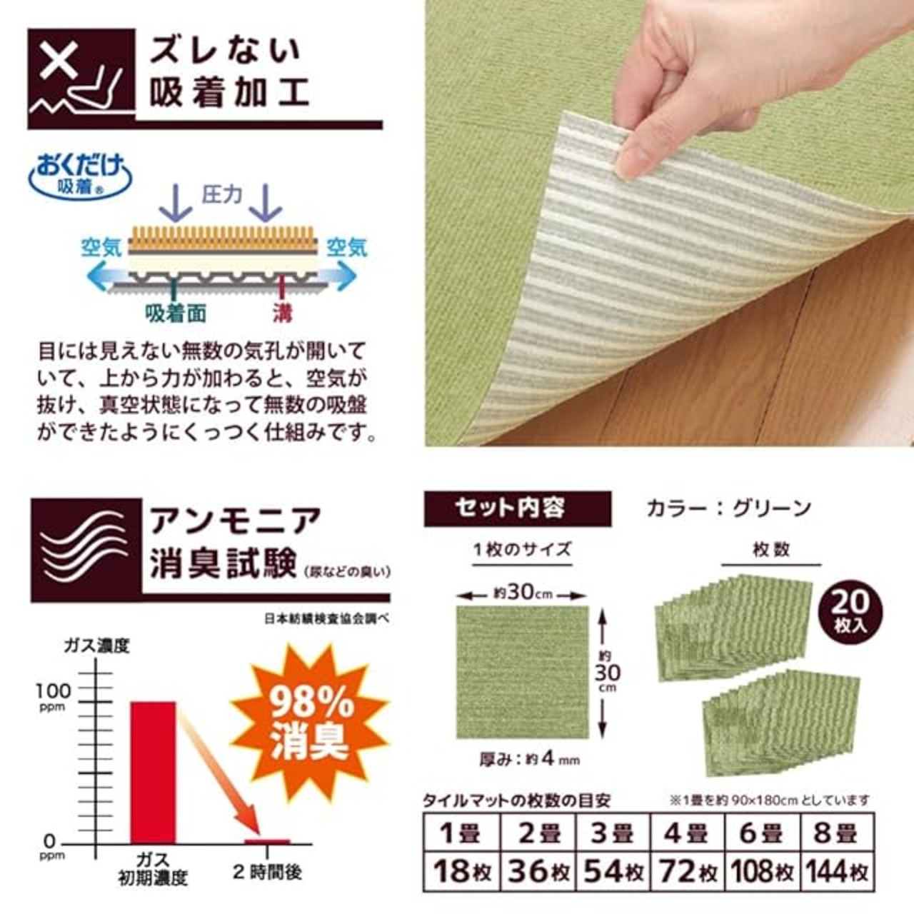 商品名:サンコー おくだけ吸着 獣医師推奨 ペット用撥水タイルマット 30cm×30cm 20枚入 グリーン 犬 猫 サンコー カーペット 【日本製 撥水 消臭 洗える ハサミでカット可】 KM-02