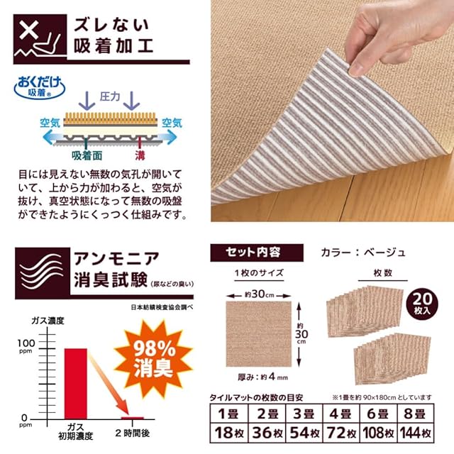 商品名:サンコー おくだけ吸着 獣医師推奨 ペット用撥水タイルマット 30cm×30cm 20枚入 ベージュ 犬 猫 サンコー カーペット 【日本製 撥水 消臭 洗える ハサミでカット可】 KM-04