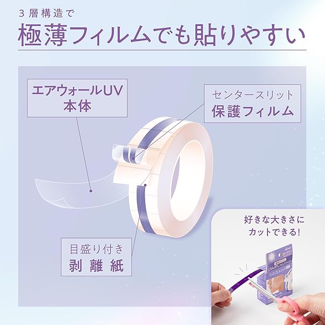 【商品の仕様】 ■型番:MA-E3019-U ■幅×長さ:19mm×3m ■内容量:1巻 ■材質:ポリウレタンフィルム、アクリル系粘着剤 ■フィルム厚:7ミクロン(0.007ミリ) ■色:透明 ■原産国:日本 ■UVブロック率:約97% (UV透過率試験調査結果に基づく 2012年 株式会社共和調べ)