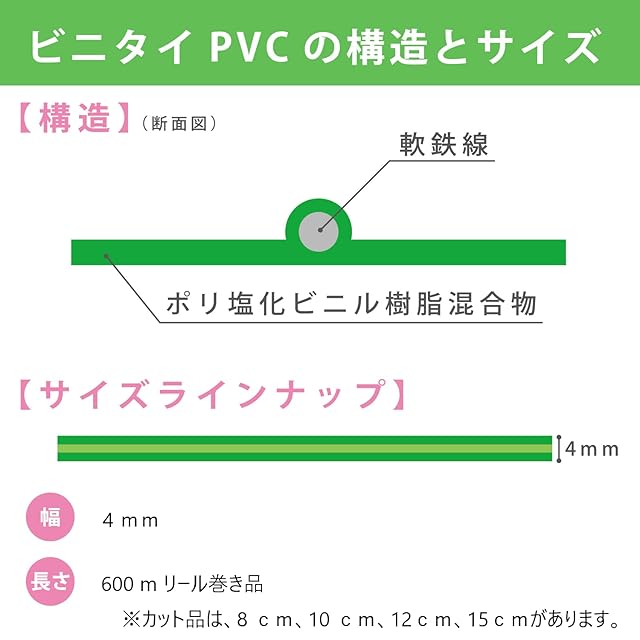 リール品はビニタイ結束機でご使用をオススメします。ハサミなどで必要な長さに切ることも可能です。手作業で巻きつけて2~3回くらいねじることもできます。樹脂製の被覆材にワイヤー入りなので、しっかり留めることができます。