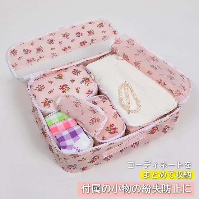 商品名:アストロ 収納ポーチ 5点セット 薄ピンク 小花柄 不織布 収納袋 衣類・下着・小物用 収納ケース 引き出し仕切り トラベルポーチ 183-35