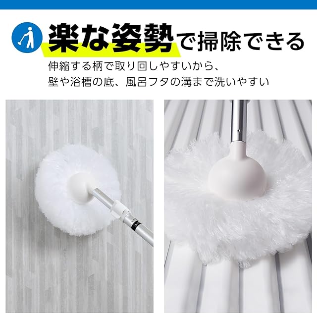 たっぷりの毛先が細かい所にも届くので、風呂ふたの溝や水栓まわりなど浴室のすみずみまでラクに洗える。
