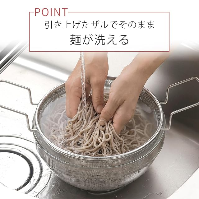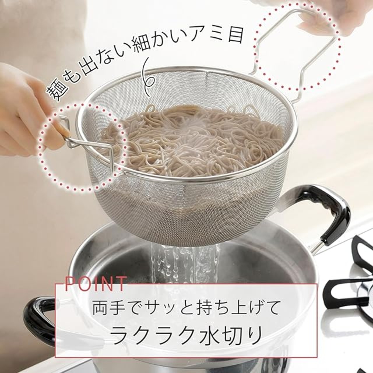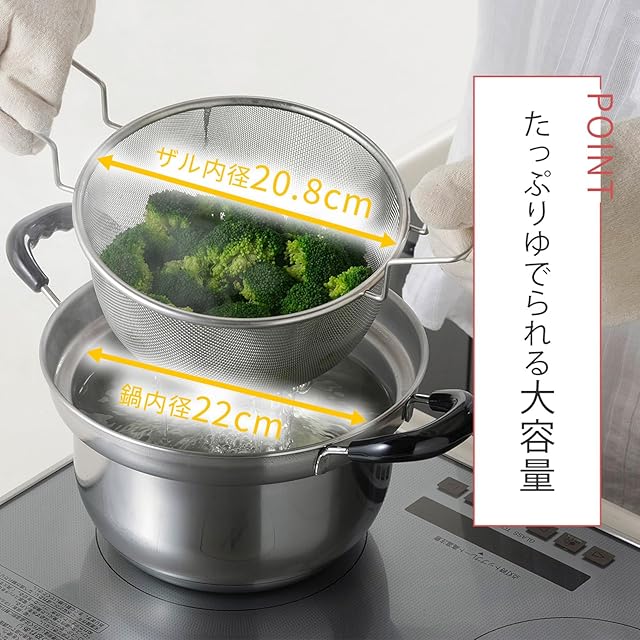 商品名:下村企販 両手鍋 ゆで名人 ザル付 22cm 【日本製】 ガス火・IH対応 ふきこぼれにくい 湯切りザル付き 麺が底にくっつかない 水切りしやすい 目の細かいアミ 4L ステンレス 燕三条 27045