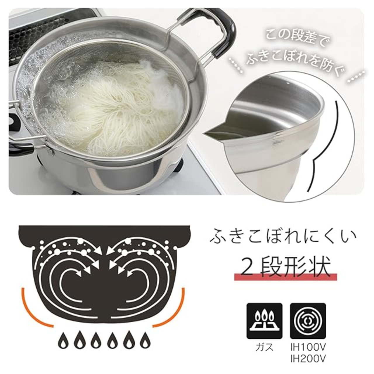 下村企販 両手鍋 ゆで名人 ザル付 22cm 【日本製】 ガス火・IH対応 ふきこぼれにくい 湯切りザル付き 麺が底にくっつかない 水切りしやすい 目の細かいアミ 4L ステンレス 燕三条 27045