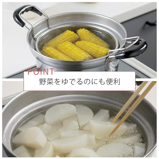 素材・材質:本体/ステンレス鋼(クローム21%)、ザル/ステンレス鋼(クローム18%・ニッケル8%)、鍋取手・ツマミ/フェノール樹脂、ツマミ用台座/66ナイロン
