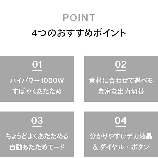 【高出力1000Wでスピードあたため】最高出力1000W※のハイパワー。スピーディーにあたためできるから忙しいときでもすぐに食事の準備が整います。 ※ レンジモードとメニューモードの「飲みもの」で作動します。 最大継続時間1分30秒が経過した後は600Wへ出力が切り替わります。
