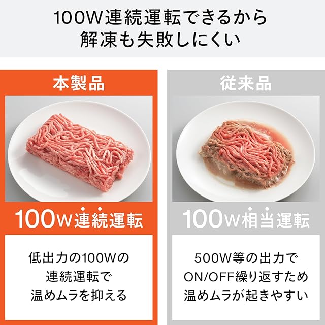 【100W連続運転の解凍できれいな仕上がり】冷凍のお肉を解凍すると煮えてしまう。そんな失敗の原因は、高い出力で急激に温めすぎていることにありました。100W連続運転の丁寧な解凍で、お肉もムラを抑えてきれいな仕上がりに。冷凍したお肉もグラム設定不要で包丁でさっくり切れる状態を実現します。