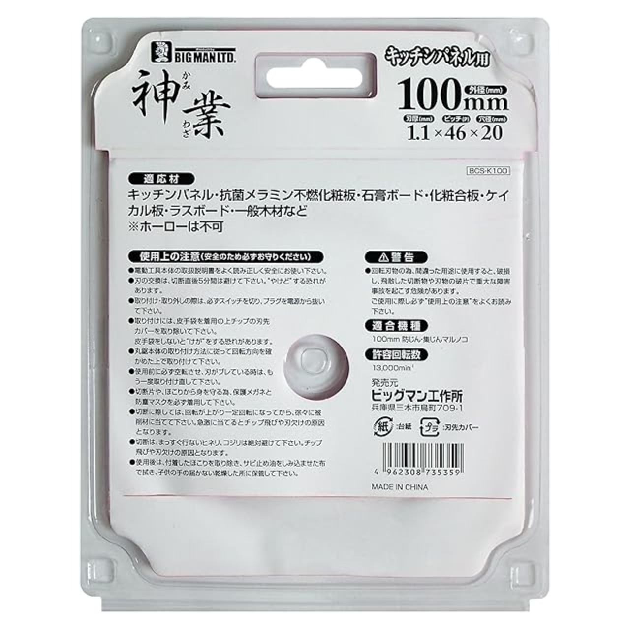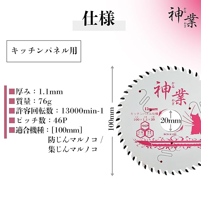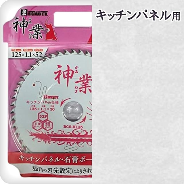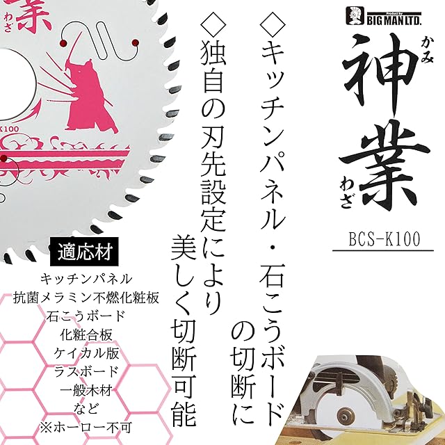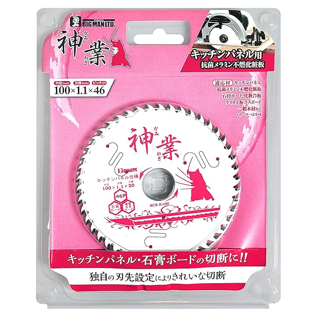 商品名:ビッグマン(Bigman) 神業チップソー 100mm キッチンパネル用(キッチンパネル、抗菌メラミン不燃化粧板、石こうボード、化粧合板、ケイカル板、ラスボード、一般木材) BCS-K100