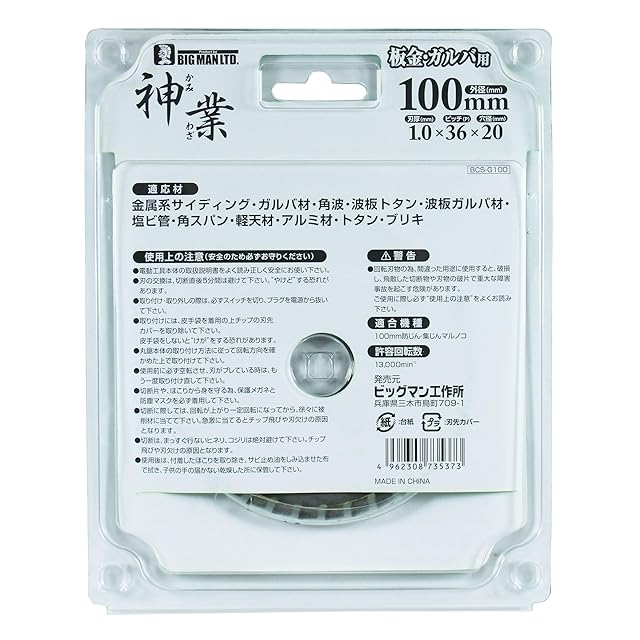 ビッグマン(Bigman) 神業チップソー 100mm 板金・ガルバ用(金属系サイディング、ガルバ材、角波、波板トタン、波板ガルバ材、塩ビ管、角スパン、軽天材、アルミ材、トタン) BCS-G100