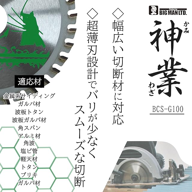 商品名:ビッグマン(Bigman) 神業チップソー 100mm 板金・ガルバ用(金属系サイディング、ガルバ材、角波、波板トタン、波板ガルバ材、塩ビ管、角スパン、軽天材、アルミ材、トタン) BCS-G100