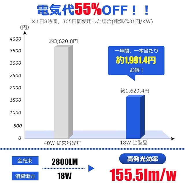 全光束2800LMの明るさで、従来40W形をしっかり代替。消費電力は18Wで電気代を約55%削減。