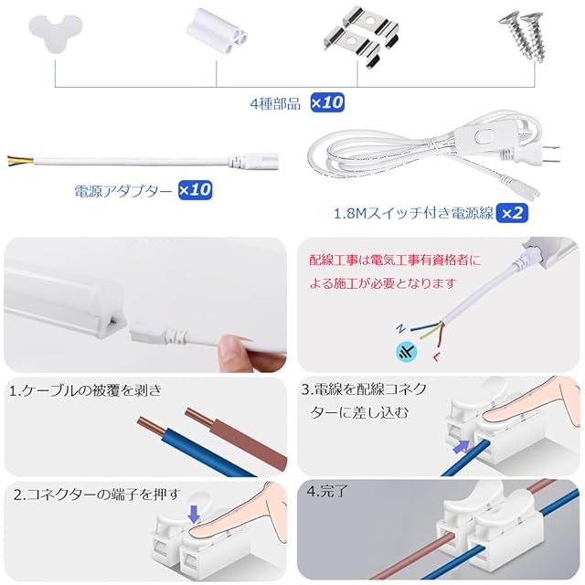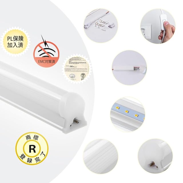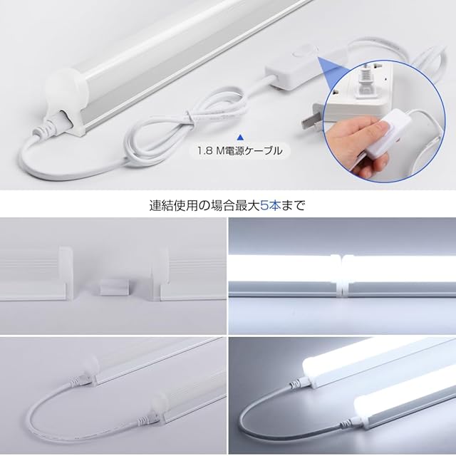全光束2800LM 消費電力:18W(40W相当) 電圧:AC85V-265V 長さ:120cm 付属品:スイッチ付き電源コード*2、固定金具*20、ネジ*20、連結アダプタ*10、保護キャップ*10、ケーブル*10