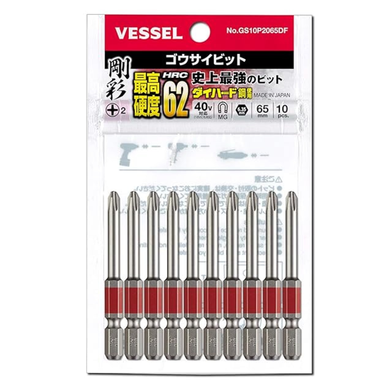 商品名:ベッセル(VESSEL) 40V対応 片頭プラス 剛彩ビット +2×65 10本組 GS10P2065DF