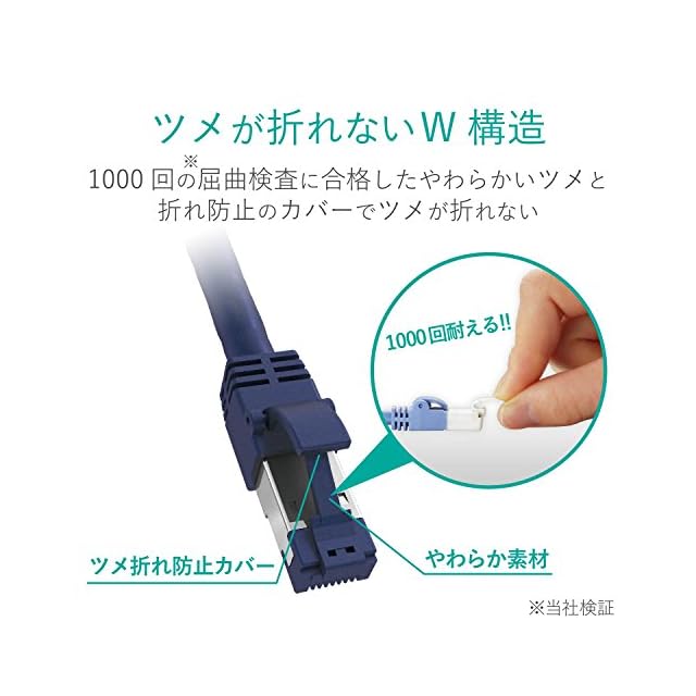 ツメ折れ防止プロテクターと屈曲に対する耐久性が高い素材のコネクターを採用したダブル構造で、ツメが折れにくいLANケーブルです。※1000回の屈曲検査に合格(当社検証)
